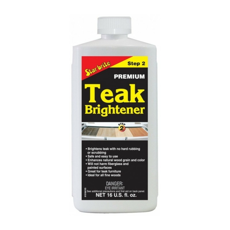 Φωτίζει το teak και άλλα εκλεκτά ξύλα. Τονίζει τους κόκκους του ξύλου και ενισχύει το ζεστό φυσικό χρώμα. Χρησιμοποιήστε το ως το δεύτερο βήμα για την αποκατάσταση του γκρίζου αποξηραμένου teak. Εύκολο στη χρήση - απλώς εφαρμόστε και ξεπλύνετε. Δεν απαιτείται τρίψιμο ή τρίψιμο. Οδηγίες χρήσης: Εάν το ξύλο είναι βρώμικο ή λεκιασμένο, χρησιμοποιήστε πρώτα το Star brite Premium Teak Cleaner. Ανακινείστε καλά.Εφαρμόστε με σφουγγάρι, πανί ή πινέλο προς την κατεύθυνση του κόκκου ξύλου. Αφήστε να παραμείνει στην επιφάνεια για 5 λεπτά και στη συνέχεια ξεπλύνετε καλά με φρέσκο νερό. Συνιστάται η χρήση λαστιχένιων γαντιών. Ξεπλύνετε αμέσως τις διαρροές και τις σταγόνες από τις επιφάνειες που δεν έχουν υποστεί επεξεργασία. Για να διατηρήσετε και να προστατέψετε το καθαρισμένο ξύλο, εφαρμόστε Star brite Premium Golden Teak Oil ή Tropical Teak Oil Sealer.