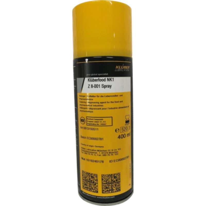 Καθαριστικό, απολιπαντικό για τις βιομηχανίες επεξεργασίας τροφίμων και φαρμακευτικών προϊόντων. Το Klüberfood NK1 Z 8-001 Spray είναι ένας οργανικός καθαριστικός παράγοντας με έγκριση NSF K1 και NSF K3. Βοηθά στην ταχεία και ενδελεχή απομάκρυνση λαδιών, λιπών, κεριών και υπολειμμάτων ρητίνης.